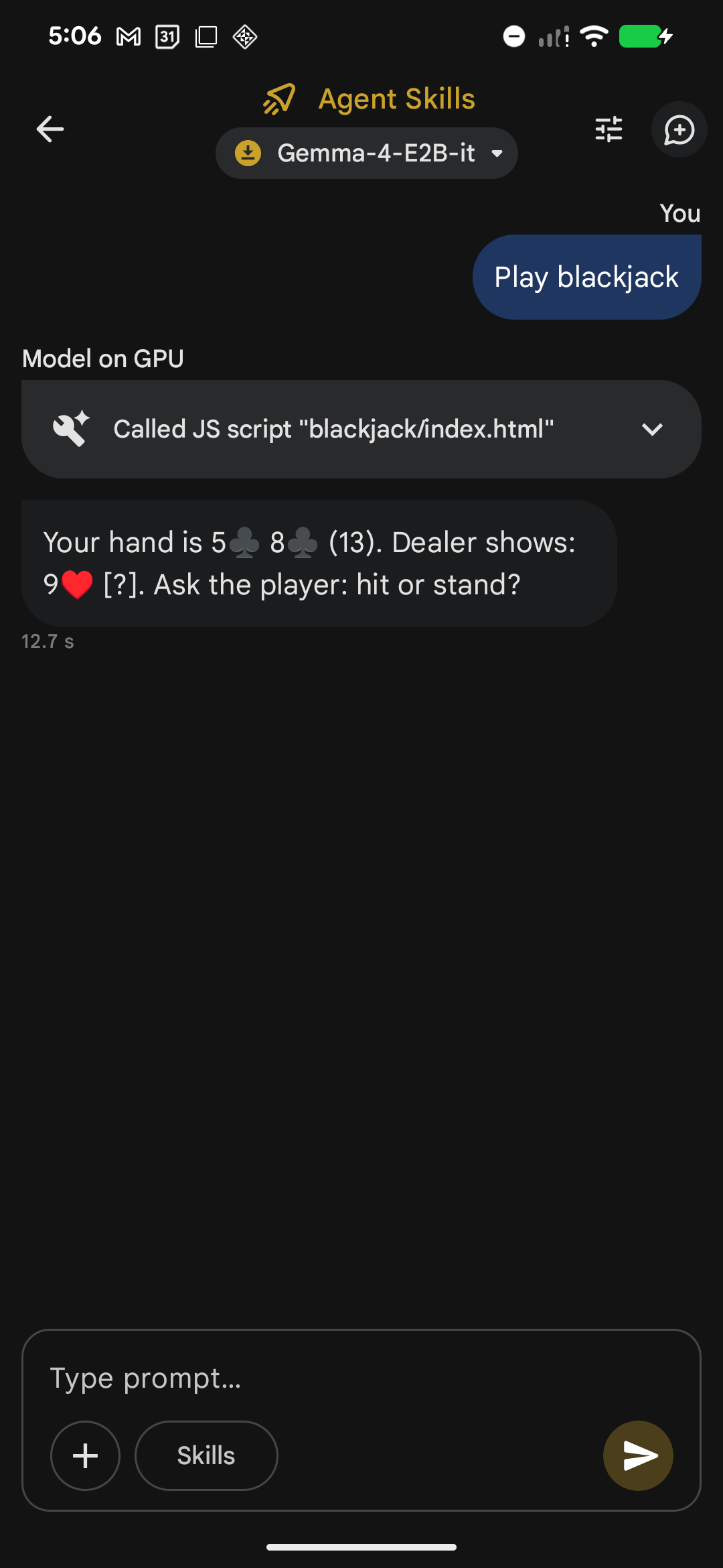 Load this skill in the Google AI Edge Gallery app using the webhost path above, then try prompts like "Play blackjack". The skill uses a hidden card encoding scheme (prefixing with "x") so the on-device LLM cannot "see" the dealer's hole card. Each action returns the full game state as text. The LLM passes card state back on each turn using the exact values from the previous result.